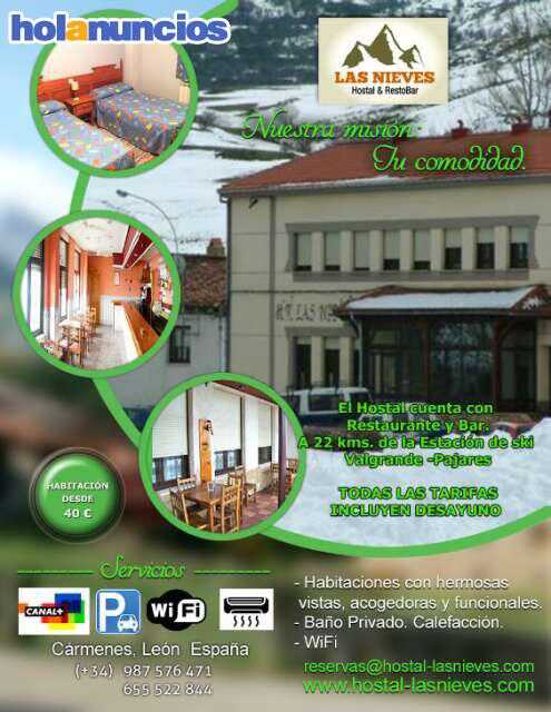 CARRETERA LEON-COLLANZO 3. alojate en el hostal las nieves, de cármenes, león. el pueblo es tranquilo con su gente amable, cerca de las cuevas de valporquero y a 22 kms. de la estacion de ski de valpajares. parking descubierto, wifi calefaccion -canal plus! . senderismo, bonitos y pintorescos alrededores entre castaños y robles, desde 40 dia - 2 personas! . . . www. hostal-lasnieves. com facebook: https: //www. facebook. com/profile. php?id=100011052361404. 1ª Planta. Amueblado. Calefacción