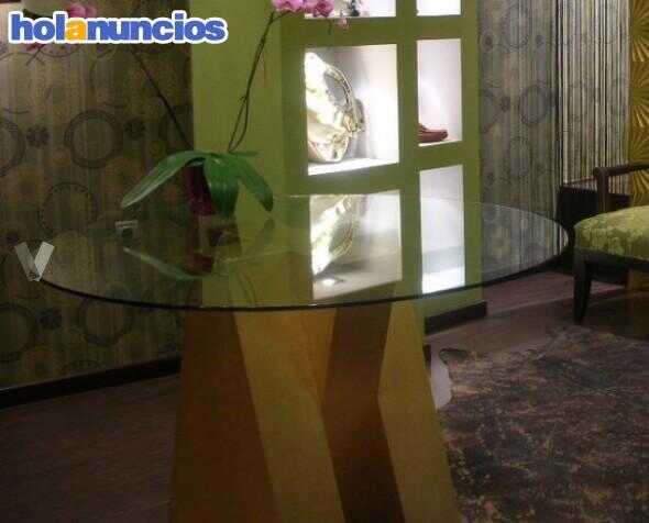 Mesa circular de cristal con pié en pan de oro precio original 574€.